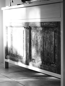 Un'altro modo per fare un uso responsabile dei materiali è il riciclo/riutilizzo. Questo è un campo molto interessante quanto ricco di sorprese. Riguardo al comò qui a fianco il processo di lavorazione è stato inverso; di solito gli sportelli di un mobile sottostanno alla struttura del mobile stesso e nascono in funzione di esso, qui non è stato così.